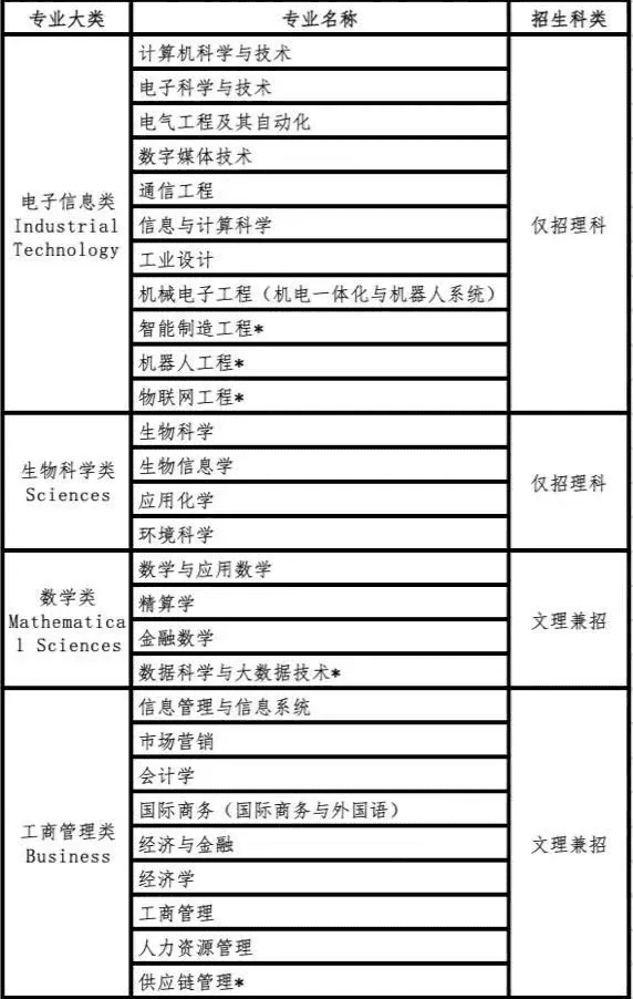 西交利物浦大学按照专业大类进行招生。中文专业大类名称仅做填报志愿时使用,准确名称以英文为准。2019年招生专业分为MathematicalSciences(数学类)、Sciences(生物科学类)、IndustrialTechnology(电子信息类)、Business(工商管理类)、BuiltEnvironment(建筑类)和HumanitiesandSocialSciences(外国语言文学类)六个大类。