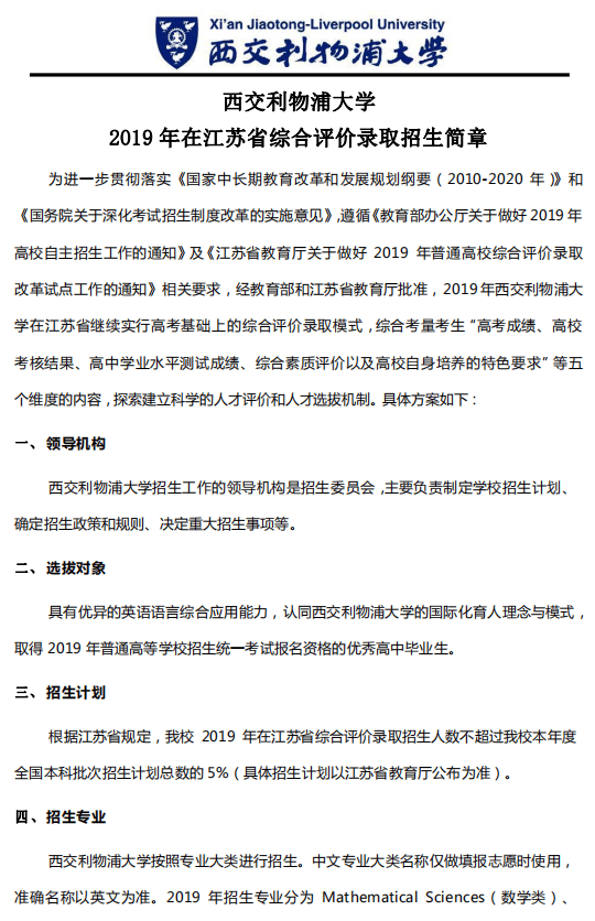 西交利物浦大学2019年在江苏省综合评价录取招生简章